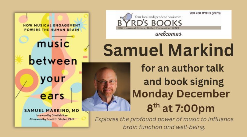 Please join us for an author event of Music Between Your Ears: How Musical Engagement Powers the Human Brain by Samuel Markind on Monday December 8th at 7:00pm. About the book: Why does almost every baby respond to rhythms and melodies long before they respond to speech? In Music Between Your Ears, Dr. Samuel Markind shows that the brain is hardwired for musical response not merely for entertainment, but for evolutionary benefit. Written with clarity so that the layperson can understand complex brain activity, this book is a milestone toward the understanding of just how and why music is central to human existence.--Orin Grossman, PhD, Fairfield University